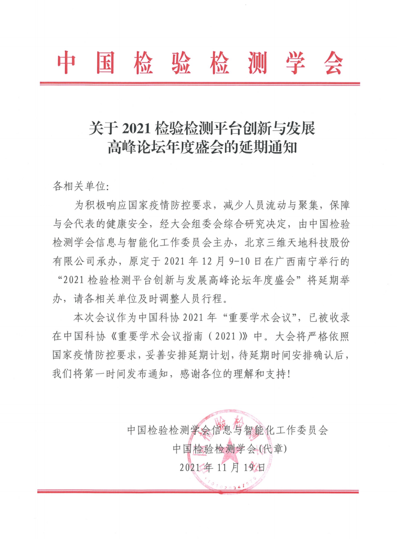 關(guān)于2021檢驗檢測平臺創(chuàng)新與發(fā)展高峰論壇年度盛會的延期通知