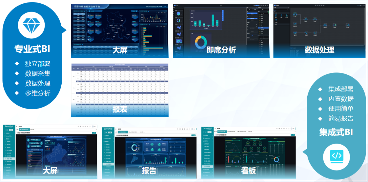 集成式BI是LIMS系統(tǒng)內置的將內部數(shù)據(jù)到數(shù)據(jù)可視化展現(xiàn)的一種解決方案。集成式BI提供20余種圖表組件及對應的輔助配置、輔助工具,通過拖拽式的場景設計,滿足用戶對于大屏、報告和看板的需求。