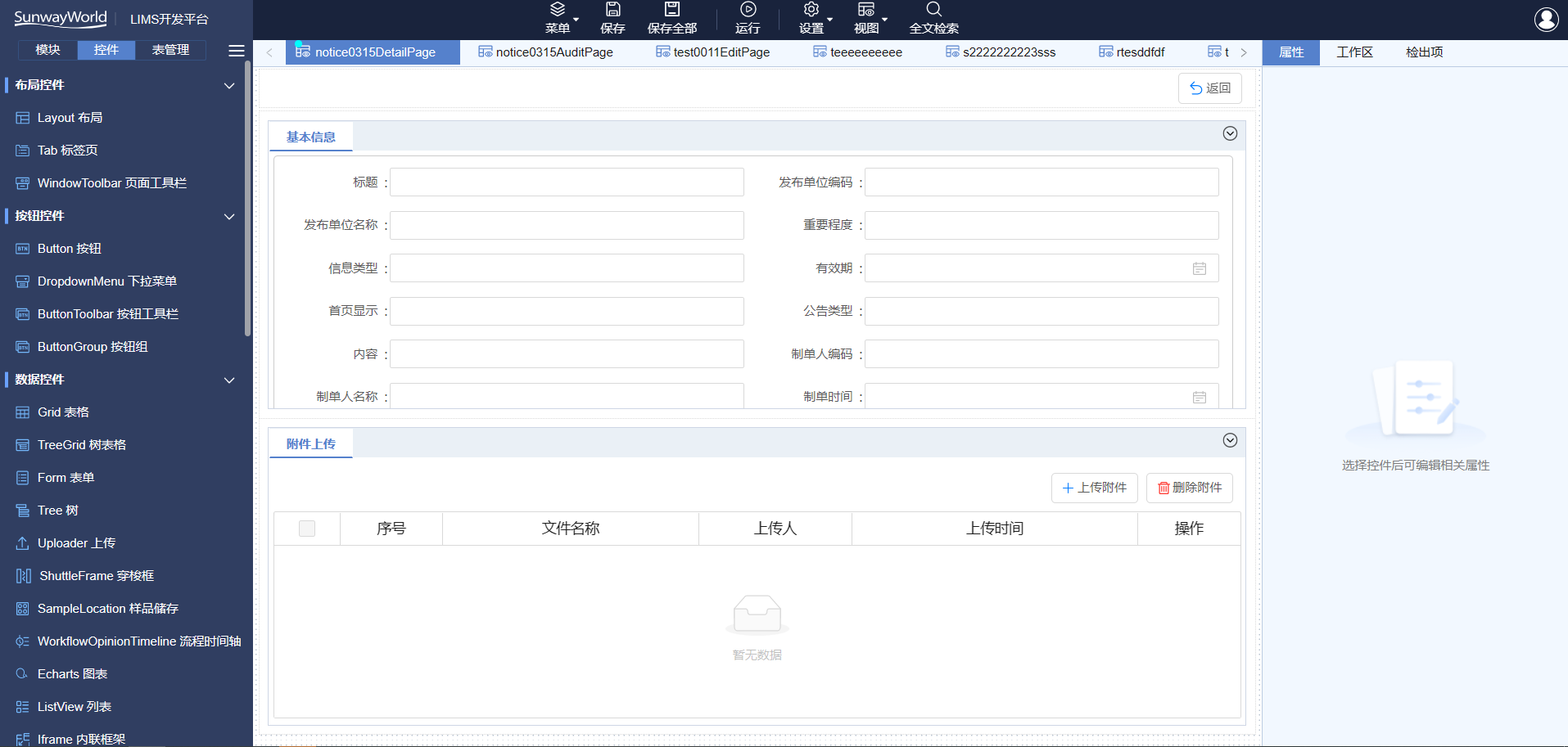 平臺(tái)內(nèi)置LIMS產(chǎn)品的所有界面控件,分為布局控件、按鈕控件、數(shù)據(jù)控件、輸入控件、導(dǎo)航控件等,通過(guò)拖拽方式即可繪制出界面,方便項(xiàng)目實(shí)施,客戶后續(xù)可自行維護(hù),方便快捷。