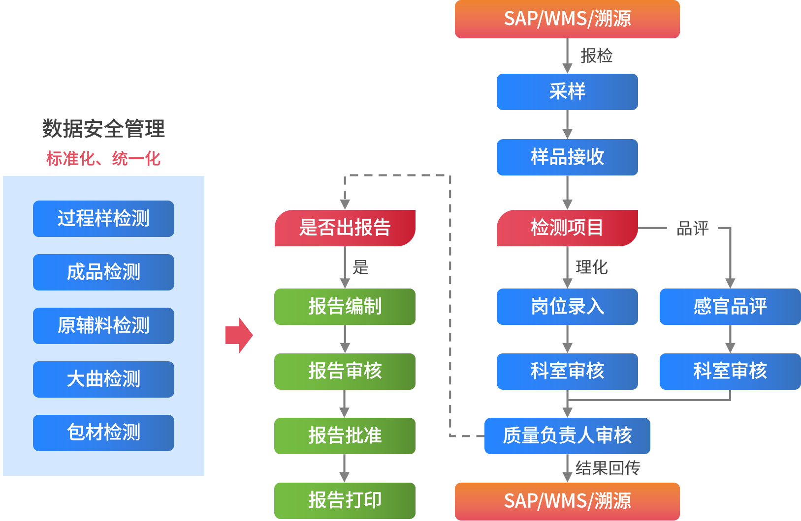 對(duì)于白酒企業(yè)而言,質(zhì)量檢測(cè)部門肩負(fù)著企業(yè)眾多檢測(cè)任務(wù),涵蓋從研發(fā)、生產(chǎn)到產(chǎn)品出廠的各個(gè)階段,而LIMS系統(tǒng)在這些環(huán)節(jié)中扮演著至關(guān)重要的角色。LIMS系統(tǒng)不僅能夠管理新產(chǎn)品研發(fā)過(guò)程中的檢驗(yàn)工作,還能夠處理包括原料進(jìn)廠、生產(chǎn)過(guò)程中的產(chǎn)品、最終出廠的成品以及所有相關(guān)生產(chǎn)材料的檢測(cè)信息。