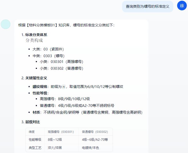 智能問答交互:用戶只需通過自然語言輸入問題(如“查詢類別為xxx的標(biāo)準(zhǔn)定義”、“根據(jù)物料長描述xxx推薦物料分類”),系統(tǒng)自動(dòng)解析問題并精準(zhǔn)匹配知識(shí)庫中的物料標(biāo)準(zhǔn)信息,無需復(fù)雜操作。
