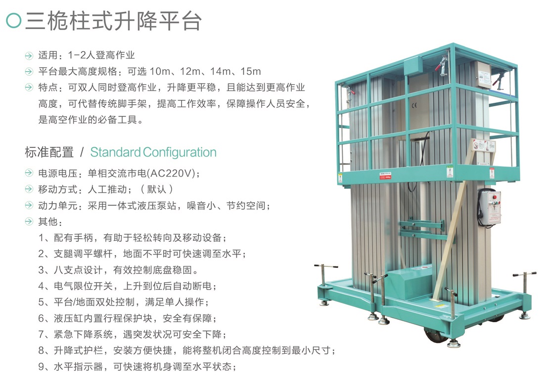 特點(diǎn):可雙人同時(shí)登高作業(yè),升降更平穩(wěn),且能達(dá)到更高作業(yè)高度,可代替?zhèn)鹘y(tǒng)腳手架,提高工作效率,保障操作人員安全,是高空作業(yè)的必備工具。